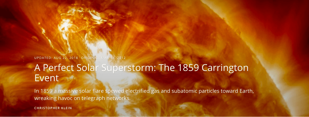 That night, telegraph communications around the world began to fail; there were reports of sparks showering from telegraph machines, shocking operators and setting papers ablaze. All over the planet, colorful auroras illuminated the nighttime skies, glowing so brightly that birds began to chirp and laborers started their daily chores, believing the sun had begun rising. Some thought the end of the world was at hand, but Carrington’s naked eyes had spotted the true cause for the bizarre happenings: a massive solar flare with the energy of 10 billion atomic bombs. The flare spewed electrified gas and subatomic particles toward Earth, and the resulting geomagnetic storm—dubbed the “Carrington Event”—was the largest on record to have struck the planet.