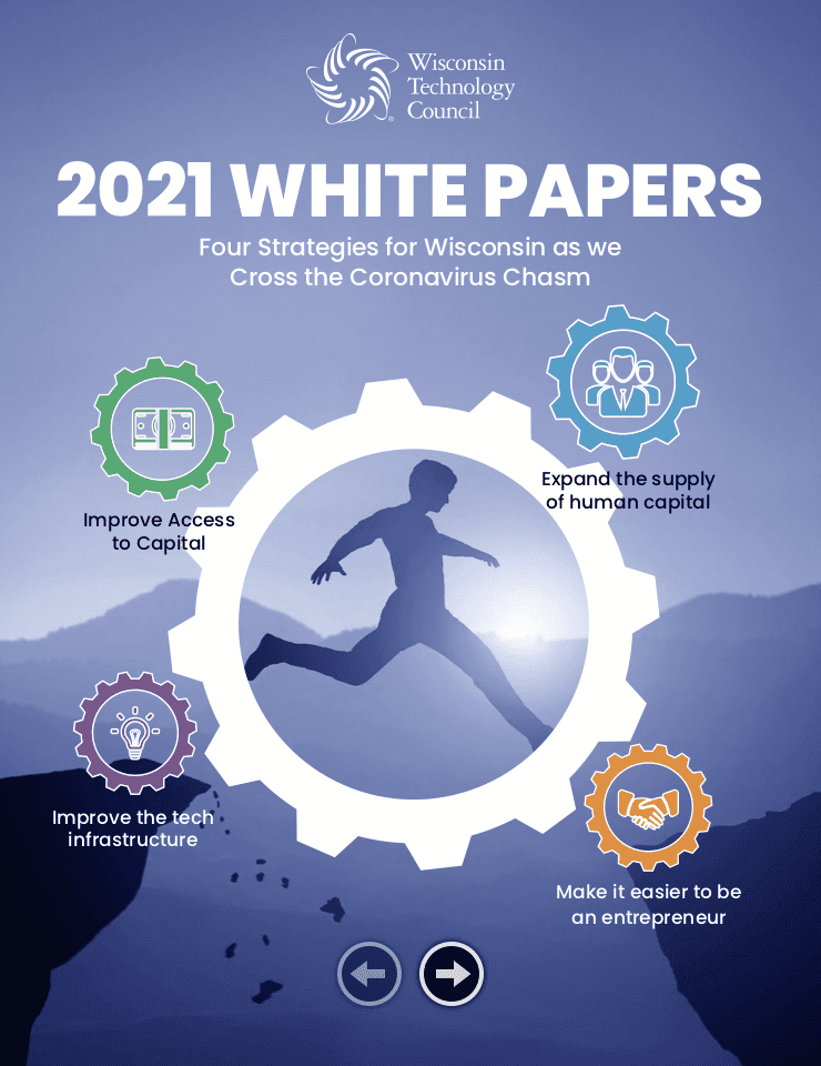 Improving access to capital for Wisconsin entrepreneurs, building the supply of human capital, enhancing the startup and business climate, and improving our tech delivery systems are four major themes of the Tech Council’s 2021 “white papers” report, called “Crossing the Coronavirus Chasm.”