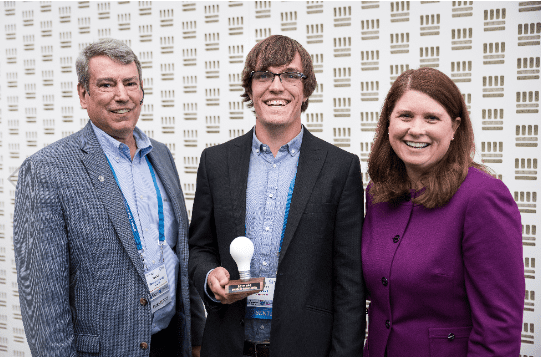 Seedlinked’S Dylan Bruce with Tech Council’s Tom Still and DFI’s Kathy Blumenfeld at the 2019 Wiscosnin Entrepreneurs’ Conference, where they won the “Bright New Idea” award